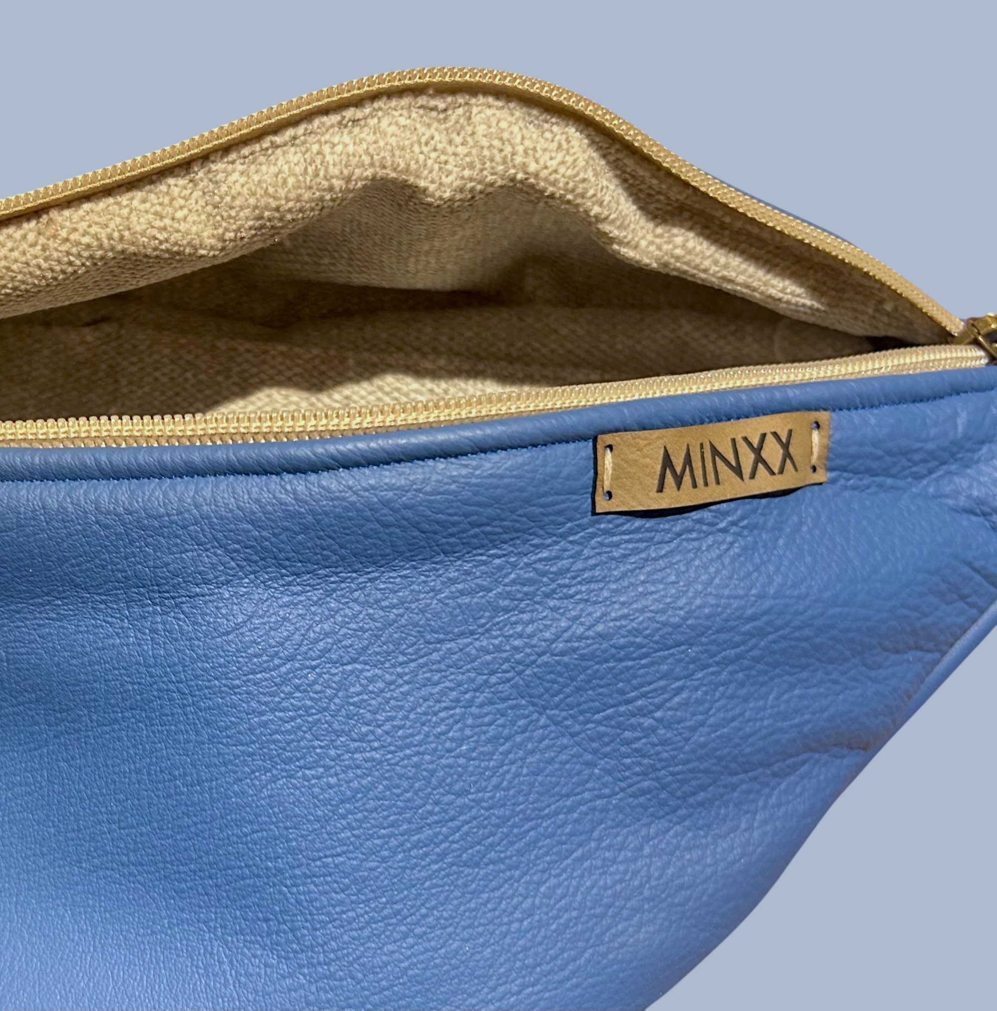 Gorgeous soft leather bumbag in vibrant sky blue with beige two way zip